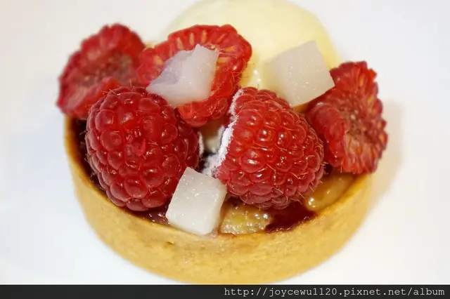 杏仁塔 玫瑰覆盆莓果醬 新鮮覆盆莓,白色的球是馬斯卡邦起司 荔枝果凍