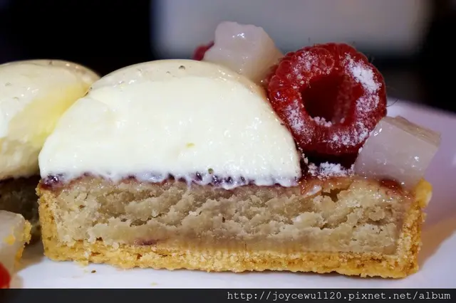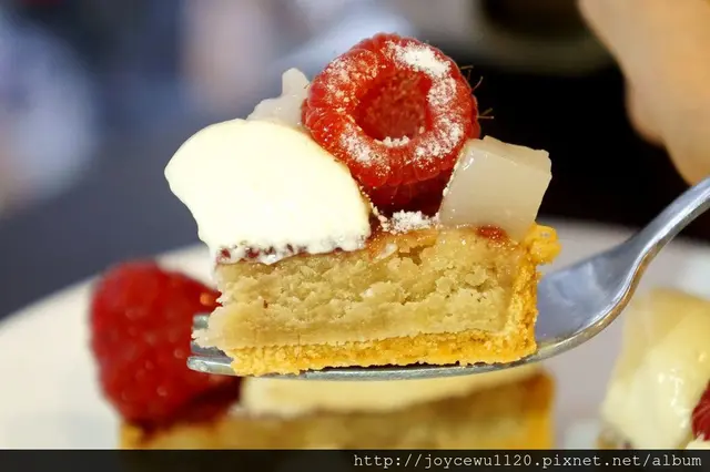 像磅蛋糕般密實的厚塔底香氣十足,帶著甜甜玫瑰飄香,新鮮覆盆莓酸甜多汁爽口