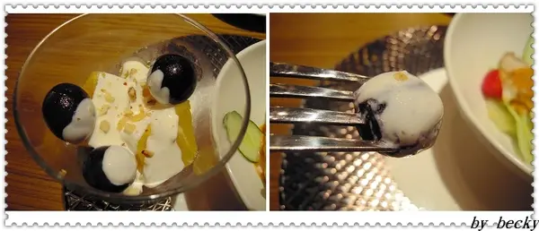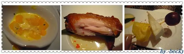 沒多久前菜就上桌了,服務生還說要先吃炸物再吃水果;蝦球部份淋的醬汁是芒果醬,蝦肉吃起來很有彈性,配上酸甜醬汁很易入口,雞翅部份烤的很入味,但油脂過多,水果部份灑上的香料,我覺得帶些微辣口感。