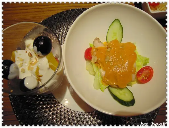 水果沙拉~是新鮮的水果再上優格,水果非常甜配上優格,非常清爽;雞肉沙拉則是特殊的沙拉醬搭配生菜及雞肉,微甜辣的口感加上花生顆粒及青脆的生菜,倒是很容易入口,只是雞肉的口感太粉了,比較不喜。
