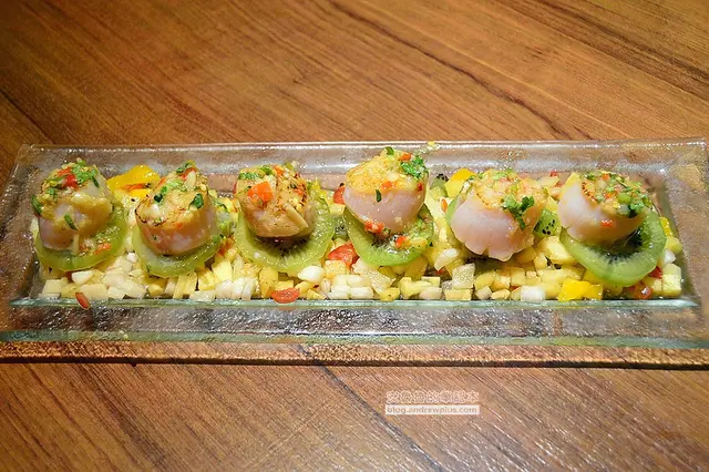 六顆外層微微炙燒,內層保持鮮嫩的大干貝,單吃是多了上頭醬汁的微鹹辣,混合底層的奇異果和綜合水果丁,入口又是另一種令人驚艷的美味