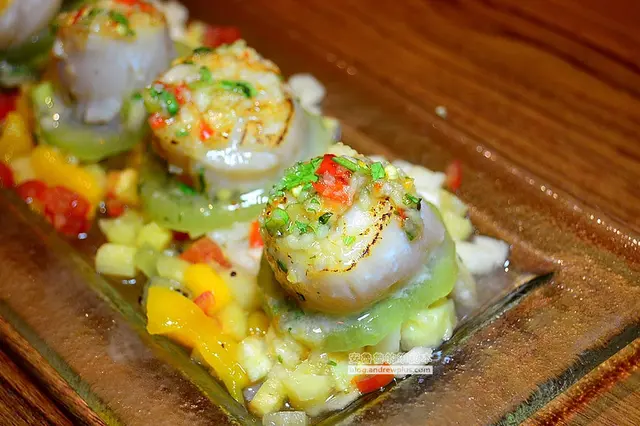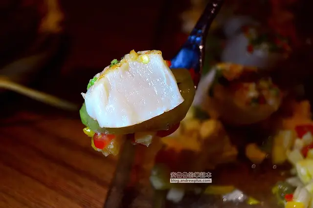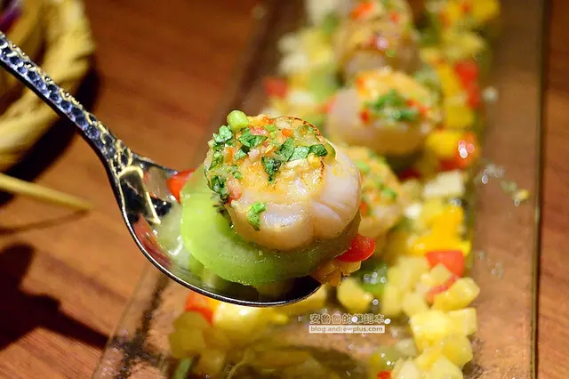 ▼軟嫩的口感搭配上微辣的鮮度以及水果丁的清甜味,在嘴裡組合成妙不可言的味道,第一次吃到用水果調味的煎干貝! 吃完了干貝,盤底的水果丁也別浪費,拿起湯匙把他也吃光光,湯汁鹹鹹甜甜,把它當水果沙拉吃