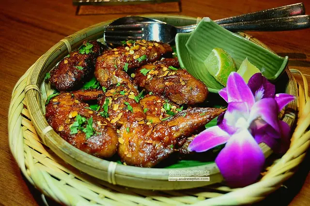 烤到外層酥脆醬汁入味的雞翅,撒上了辣椒子以及切碎的香菜,放上的檸檬角可以增添香氣和口感,雞肉的調味是酸中帶甜,吃起來有一點辣。而肉汁稍微的收乾,外層醬料較多的地方有點偏鹹,是一道下酒的好菜!