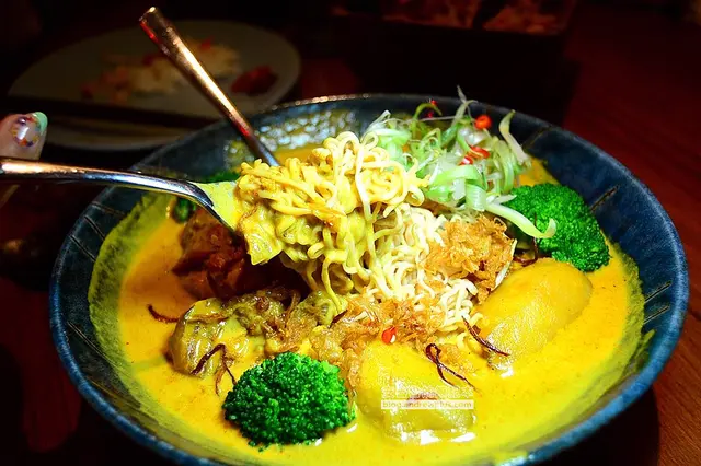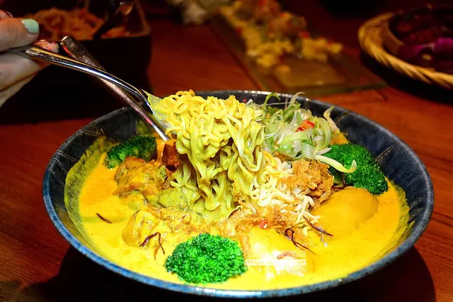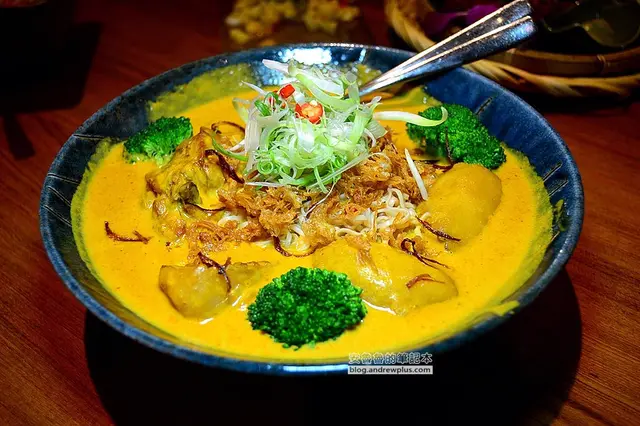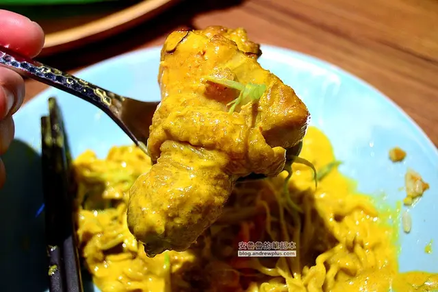 ▼麵條是泰國知名的泡麵-媽媽(MAMA)麵,特調的黃咖哩的顏色真漂亮,咖哩和椰奶的香醇味濃厚