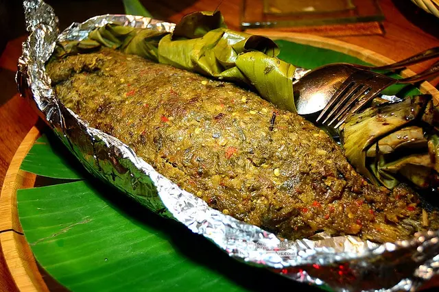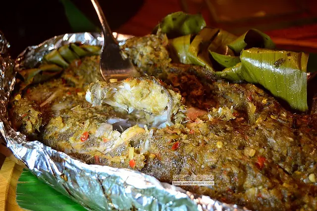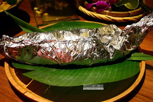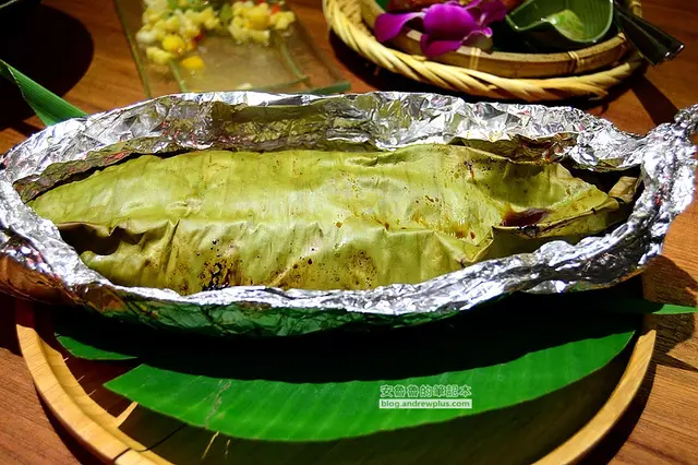 ▼結果猜錯啦~裡面還有一層用香料、芭樂葉、香茅和檸檬的佐料,把鱸魚結結實實的包了起來!!