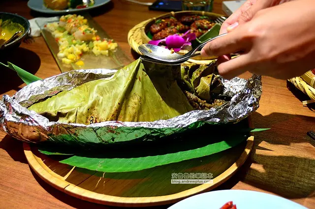 ▼店員就在桌邊服務,幫我們把鋁箔紙打開,裡面居然還用了葉子再包裹了一層!