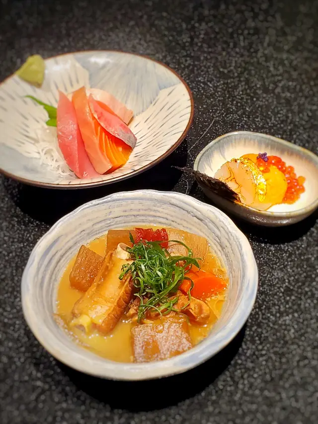 前菜兩款: 📍刺身盤~池魚、甘魚、鮭魚、鮪魚,厚切魚生件件新鮮肥美🐟 📍燉豬上排 ~蘿蔔腍腍豬肋條軟嫩,滿滿麵醬香。