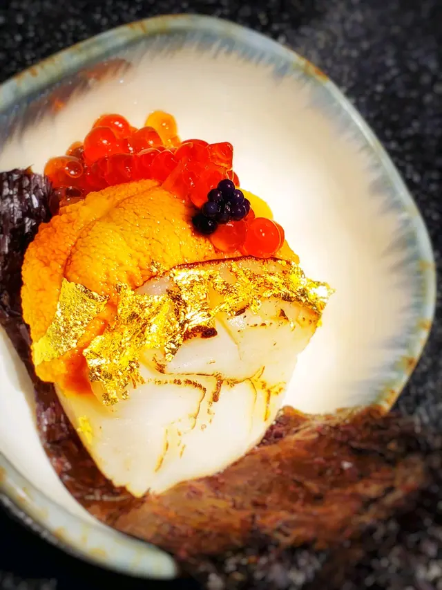 📍干貝海膽漢堡~表面微微炙燒的肉厚味甜,極富彈性北海道大干貝拌以味道甘甜,質感細膩的海膽、再加入粒粒晶瑩透亮的鮭魚卵及魚子醬,加埋金箔,以海苔片包裹🤤🤤一口咬下,咸香、鮮甜、爽脆、濃郁綿稠⋯ 極致味覺享受。