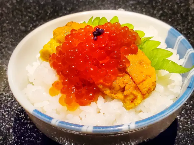 📍海膽蓋飯~北海道鮭魚卵粒粒鮮透肥美咸香🇯🇵馬糞海膽入口即化,底蘊甘甜、光亮魚子醬配上柔軟香甜的米飯🍚