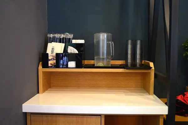 ▼然後就來去旁邊的自助區倒了兩杯飲用水回到座位上.餐盤也可以自己端回這裡回收!