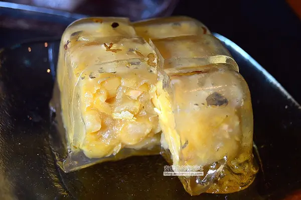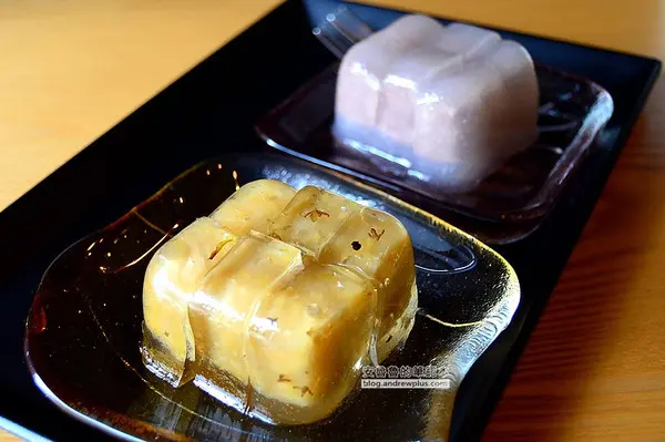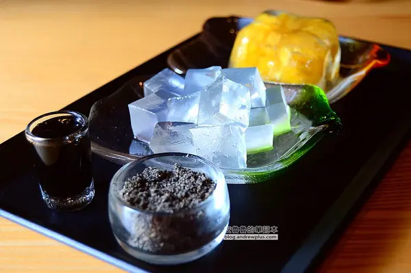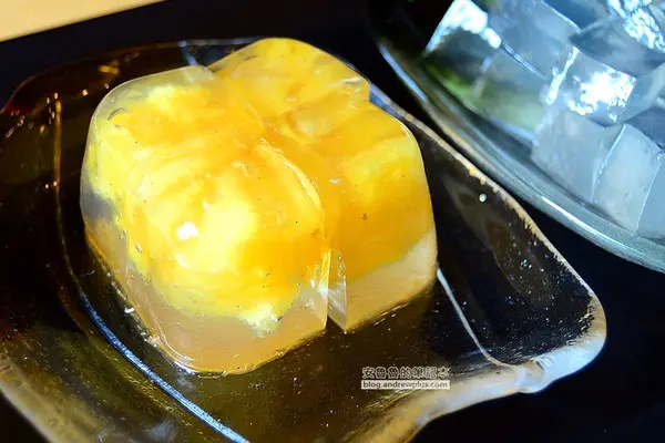 如同寶石般的晶瑩剔透,視覺上就是一種享受了,比起學生時期吃的涼圓,看起來高級好多啊!一整顆的涼菓子其實上桌的時候也已經切成了適口的大小,方便客人一口吃了!