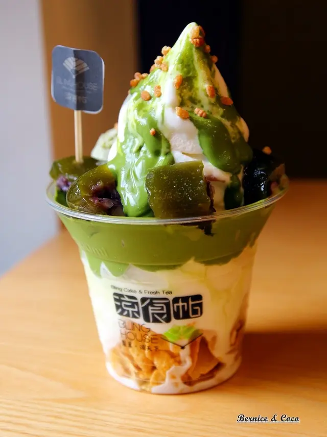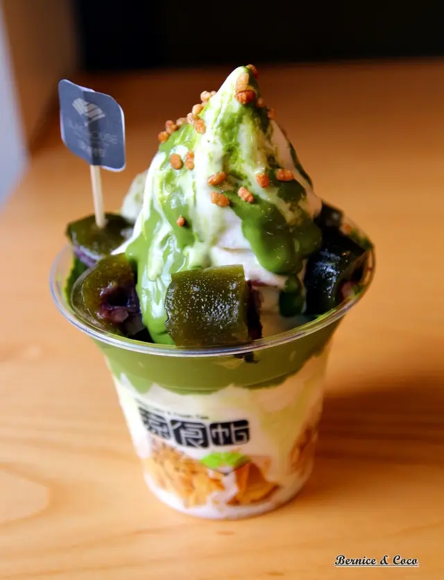 上面除了淋上抹茶醬以外,還有抹茶紅豆涼菓子,冰淇淋最底層是穀片