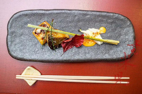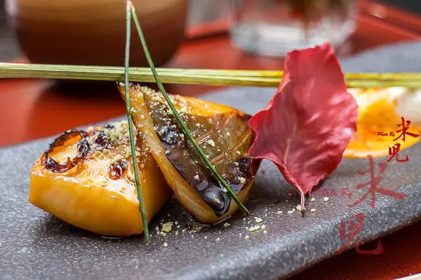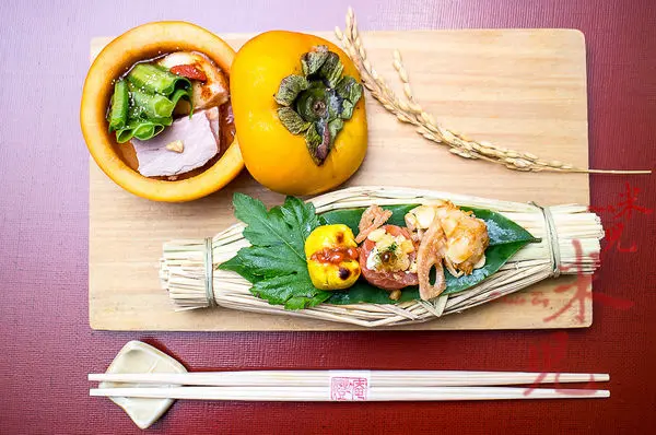 八寸是最能代表燈燈庵自然流的手工菜了,裝在柿子裡的是勾玉豆腐、花蓮壽豐老兵農場裡的山蘇、低溫熟成的油封六白豚,呈在稻草船裡的則是燻鮭豆腐卷、秋柿杏片揚、味噌薩摩芋。