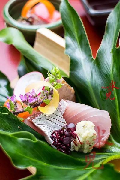 刺身,裡頭的魚是用當季產的食材,放在葉子裡上桌,看起來真的非常吸睛。