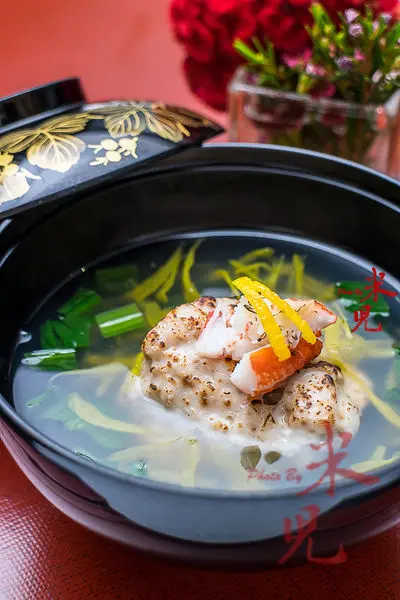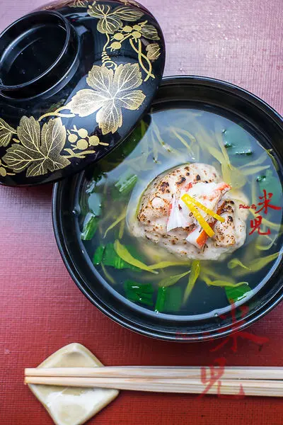 中間的真丈是用鯛魚、核桃去做成的丸子,口感鮮美而鬆軟,搭配鱈場蟹腳肉提出鮮味,湯的部分則是加了菊花瓣的柴魚昆布高湯,並加了柚子皮增加清香。