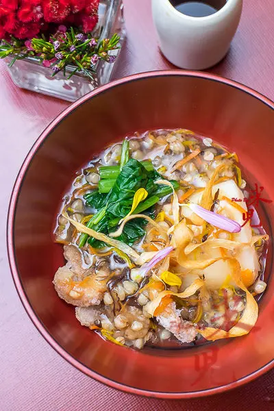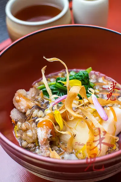 旬肴是合鴨唐揚錦秋芡,上桌時一碗看不出什麼東西的菜,但吃起來卻是意外可口,除了煎到表皮酥香的豪野鴨之外,淋在上面用南投有機果凍木耳、補血菇等菇類還有薏米做的芡汁,吃起來口感非常好,因為調味清淡中帶著鹹鮮,呈現讓人意料之外的美味。