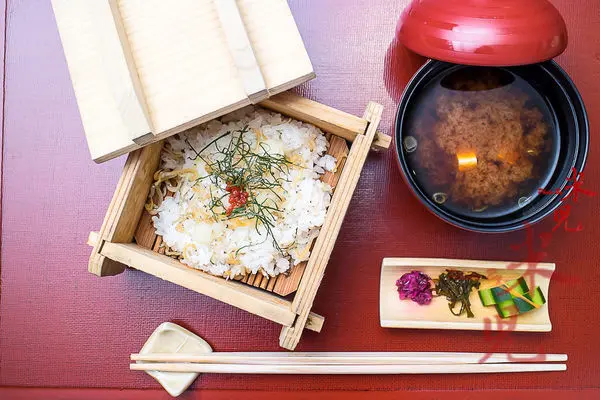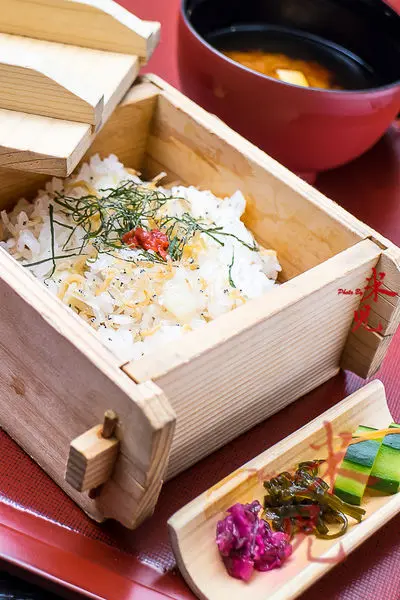 飯上面用的是南投信義鄉晨軒梅的有機鹽梅,還灑上酥炸過的吻仔魚,最後灑上紫蘇葉絲增加香氣,看起來不起眼,卻愈嚼愈有味。