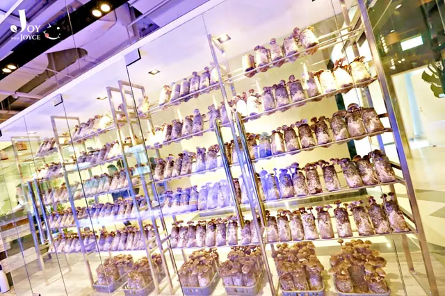 進餐廳,左側是蔚藍水族箱牆,右側則是活體菌菇牆,特別的設計,直接用海陸最「鮮」的食材迎接到訪客人。