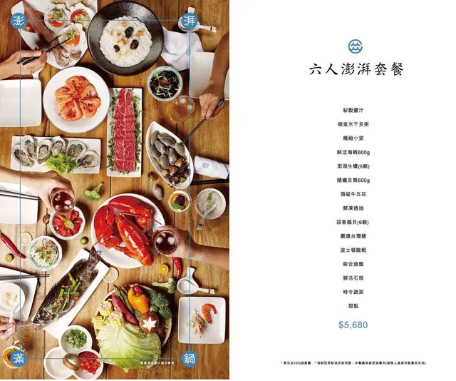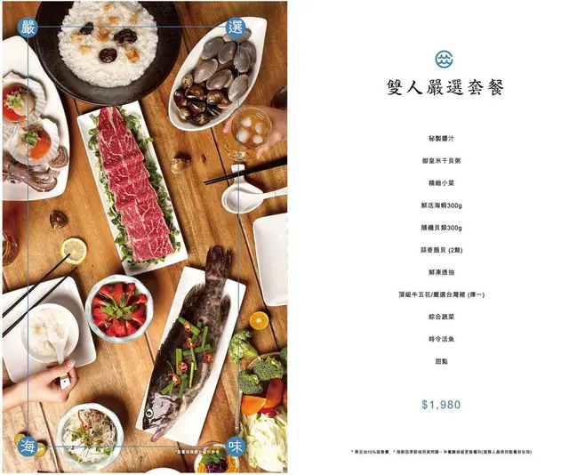 套餐:雙人嚴選$1980,雙人豪華(多了波士頓龍蝦)$2980,四人極品(多了貝類)$3680,六人澎湃$ 5680。