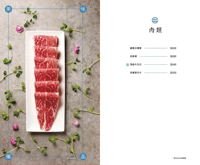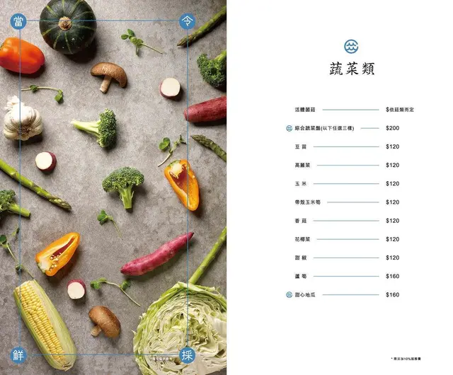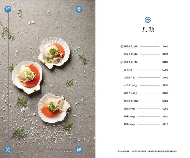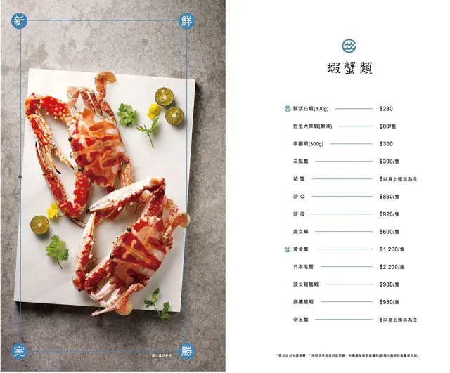 蝦蟹類$280-860/隻,頂級蝦蟹類$980-2200以上/隻,貝類$160-460,軟足類 160-320魚類 580-650,肉類 220-320,蔬菜類 120-200,活體箘菇 時價。