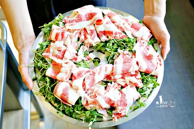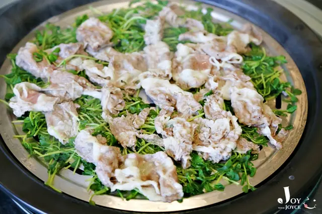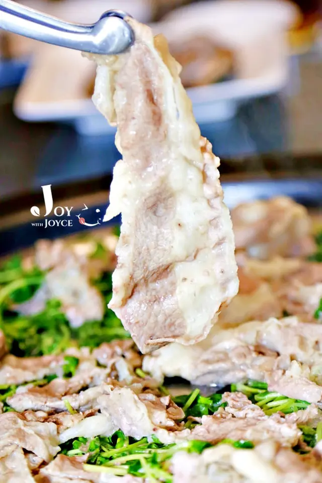 底層鋪上滿滿豆苗菜,上頭則是一片片牛五花肉,肥瘦相間,軟中充滿咬勁兒,喜歡那咀嚼中牛油香氣在脣齒間流竄的味道。