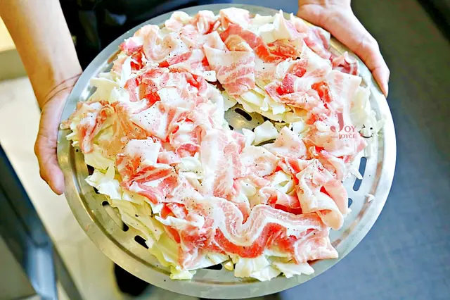 豬肉片口感紮實細嫩,單吃有著濃濃香脂味,非常迷人!我自己喜歡把整份攪拌後一起享用讓蒸出的豬油入菜,也讓高麗菜自然的甜味平衡豬肉的厚重。