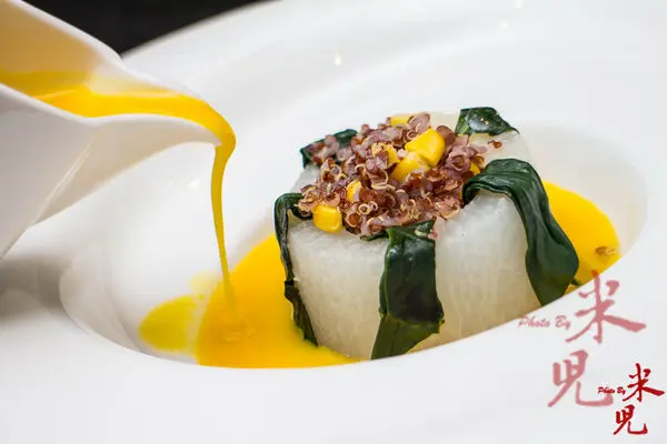 金湯黎麥翡翠,主廚選了台灣較少見的玻利維亞紅黎麥入菜,是把紅黎麥鑲在用上湯煮過的白蘿蔔裡頭,上桌前淋上用玉米和雞湯調製成的金湯,讓蔬菜的甜味融合在一起,吃起來十分清鮮甘甜~