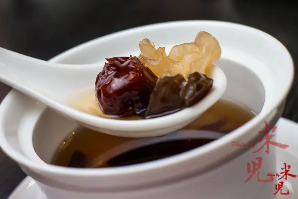 木耳紅棗燉花膠,主廚承襲南方漁民以花膠糖水養生的概念,把台灣人習慣放入燉湯或是紅燒的花膠做成甜湯,糖水部分是桂圓紅棗為基底,清甜中帶著果香,花膠吃來微脆爽口,底下還有木耳和黑豆增加嚼感,組合十分特別,默默地就會喝掉一整盅!