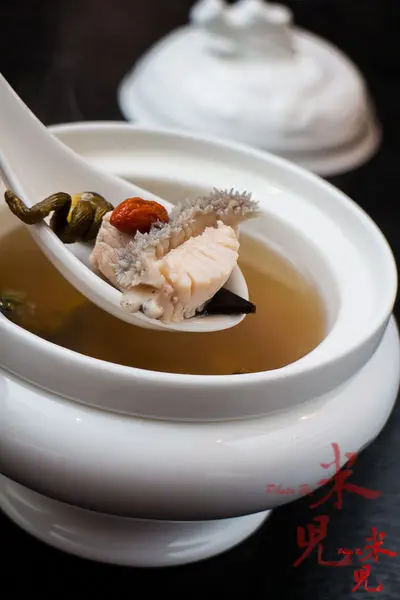 天麻魚頭滋補湯,裡頭有譚師傅從澳門帶來的野生天麻、准山、炒過的青仁黑豆、黨參、杞子、紅棗、豬後腿肉、川芎、上湯、鰱魚頭等多種食材,喝起來鮮而不腥,甘香醇美。