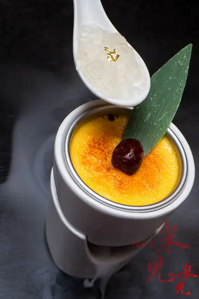 瓏皇杏汁燕窩焦糖布甸真是壓軸好戲,上桌時乾冰繚繞,還真是難以拍出那種夢幻感!東方的杏仁茶和法式焦糖布丁的完美結合,吃來濃郁而有迷人的杏仁淡香,吃的時候搭配大口燕窩絲,哇,真是一整個超奢華的美味甜點!完全是米兒最愛的組合啊!