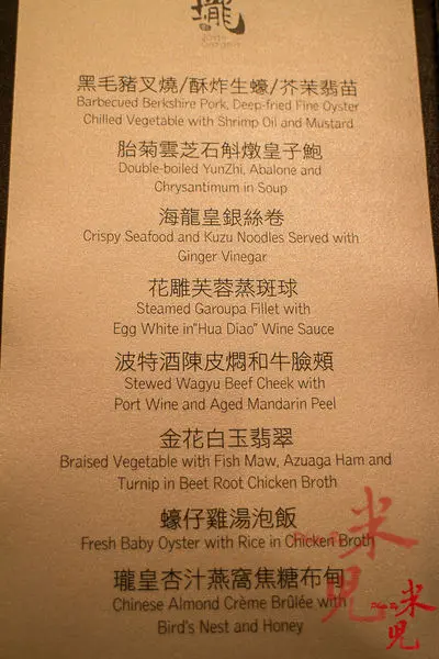 最後會送給用餐的客人這個從澳門帶來的書法作品,一面寫著菜單,一面是書法大師陳柏瑜的題字,每個人拿到的不太一樣,有點測字的趣味,這是米兒拿到的「馬踏飛燕」!