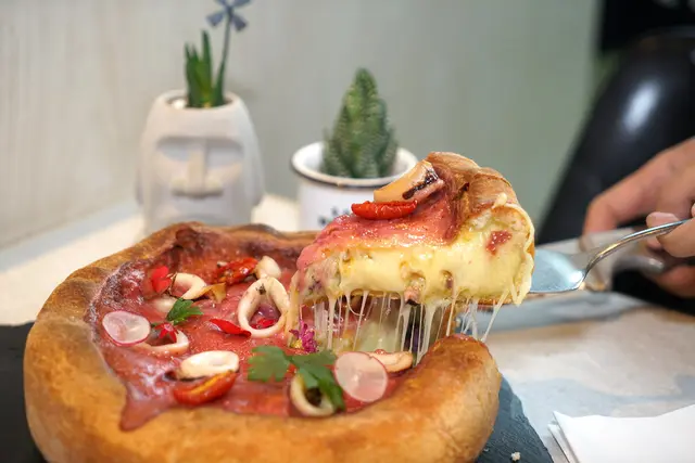 大量的乳酪絲剛上桌切開拉起~邪惡到爆炸的髮絲牽絲