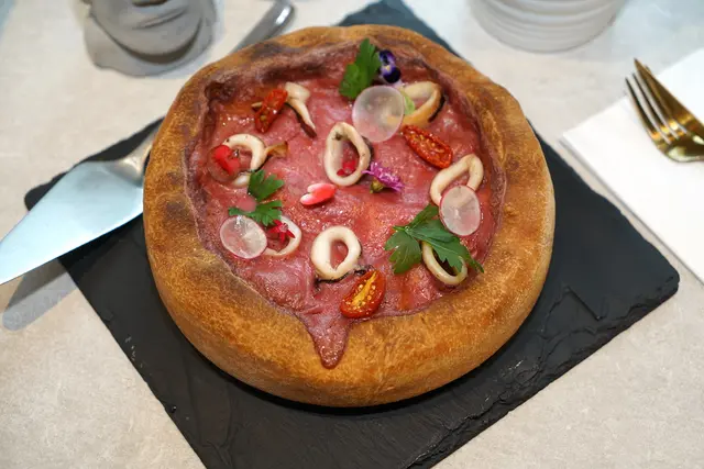 自製的深盤麵皮,上面一層粉嫩的洛神風味粉紅醬、上頭擺上透抽與時蔬