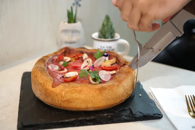附上巨無霸披薩刀與鏟子,刀子使上一點力的分食超厚的深盤披薩