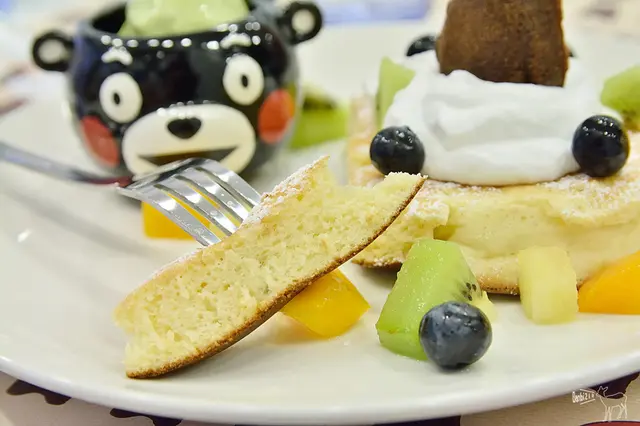 厚鬆餅帶點甜感,吃起來像是較甜的雞蛋糕那樣,上頭長的有點喜感好笑的巧克力熊本熊蛋糕則很乾硬,鮮奶油不會油膩,水果是芒果、奇異果、鳳梨罐頭、藍莓,芒果挺甜的,但藍莓倒有點酸,整體吃起來很普通。