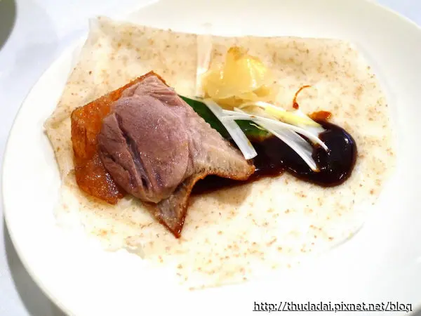 接著很快就端上烤鴨,片的方式帶一層油質與厚薄適中的肉、清香少禽味,