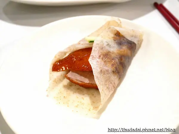 採全麥薄麵皮、佐料則有小黃瓜嫩甜薑蔥白,鴨皮堅脆度真的頗為理想啊,