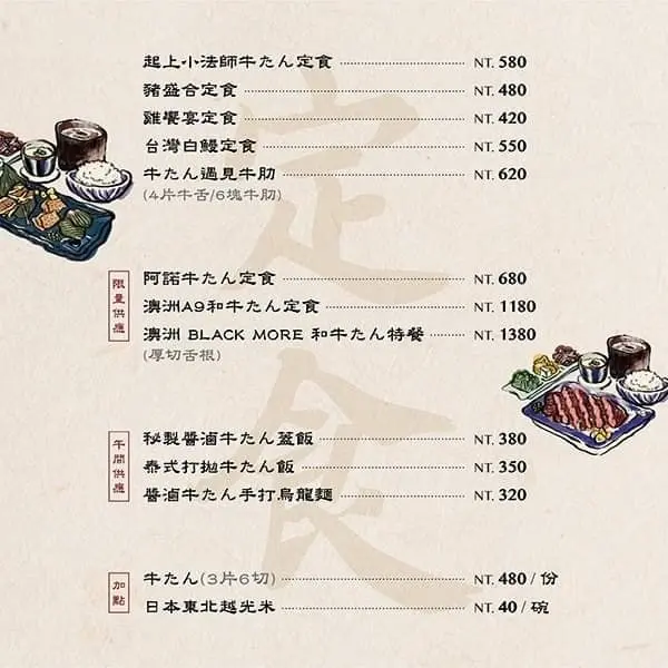 定食套餐從420元起(雞)、牛舌定食從580元起,還有豬盛合、白鰻魚