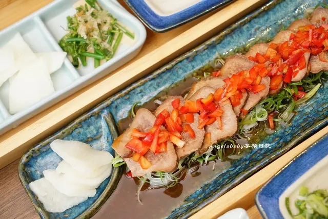 秘製醬滷牛舌切成薄片搭配紅椒、底下的洋蔥絲~一點沁涼的和風醬...開胃又清爽