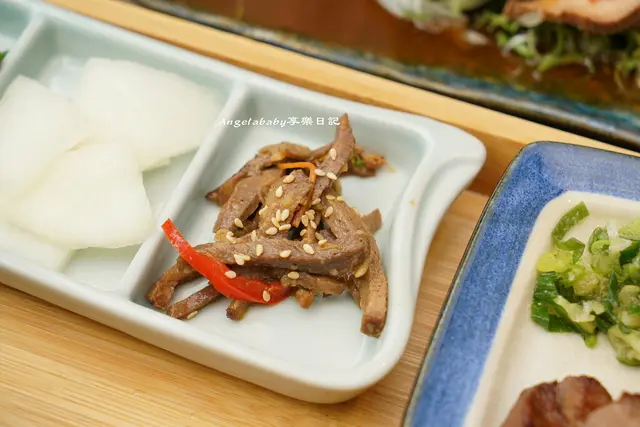 定食小菜碟上的胡麻龍鬚菜、醃漬白蘿蔔babe不特別介紹