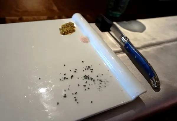 餐盤上有黃芥末,玫瑰鹽和黑色的岩鹽