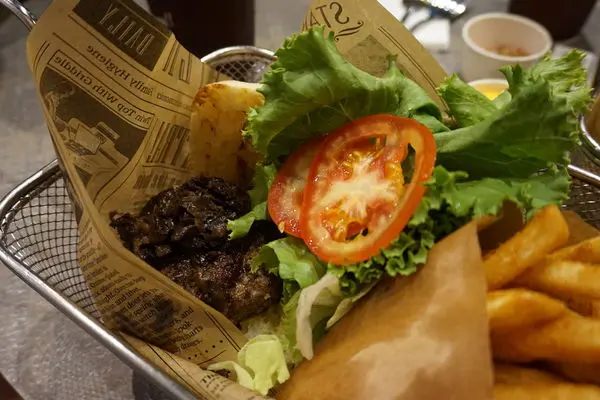接著露西要來享用五分熟招牌漢堡,小小的籃子幾乎要被漢堡擠到爆炸啦!!!