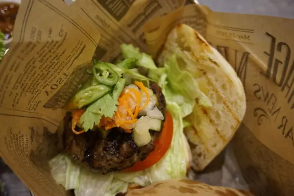 這份南洋豬肉堡中夾了辣椒、香菜、醃白蘿蔔和紅蘿蔔,