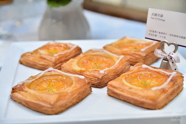太陽可頌:酥鬆的可頌搭配糖漬橙片、卡士達醬跟奶油乳酪,這道味道我覺得較容易想像得出來,搭配橙片還不錯。