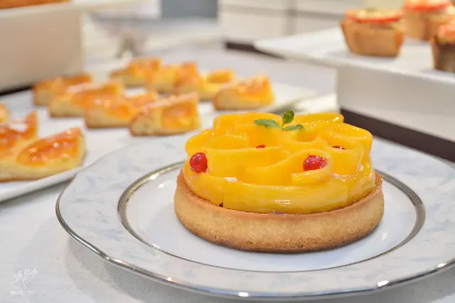 使用千層派皮吃起來微酥口感,上方刷上點杏桃果醬,吃起來有焦香味、甜味重、與奶香,我覺得好吃,不過甜度對我而言會希望降低點,話說我覺得珠寶盒法式點心坊滿多甜點都甜度較高,是他們的風格特色或許也是種堅持,也能滿足甜度接受度較高的族群。