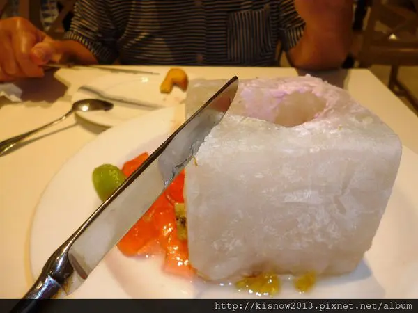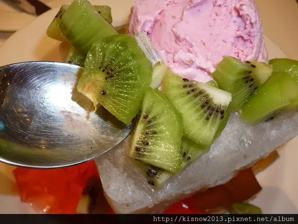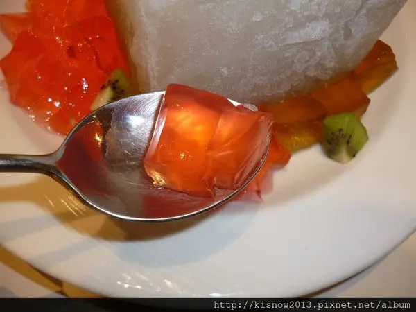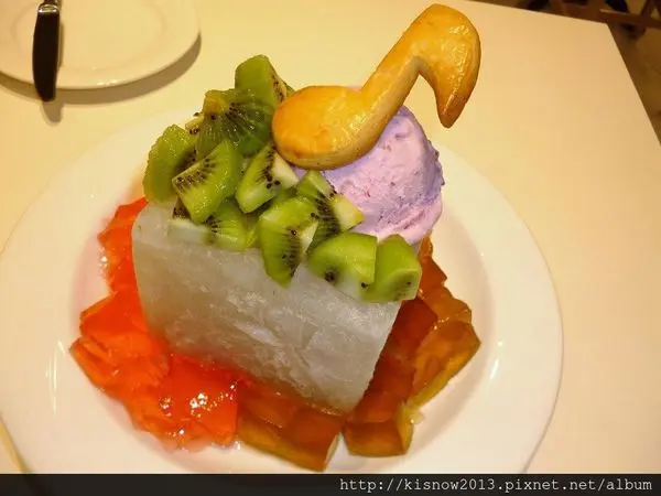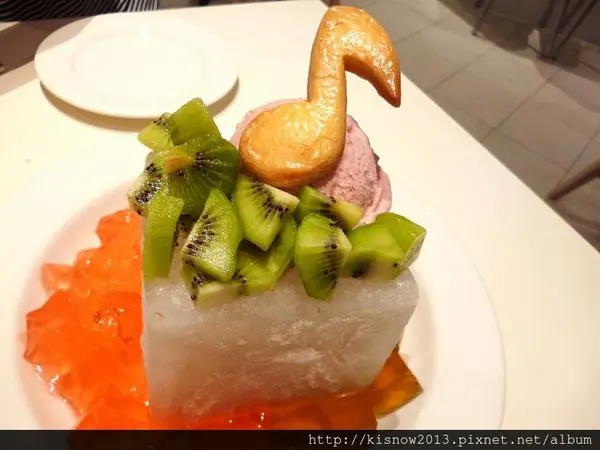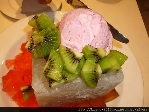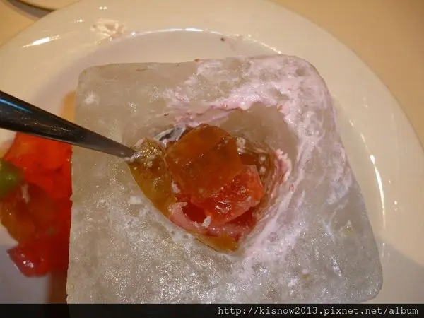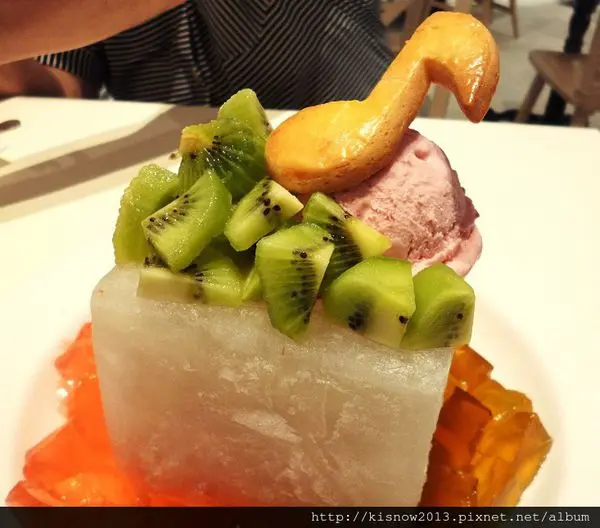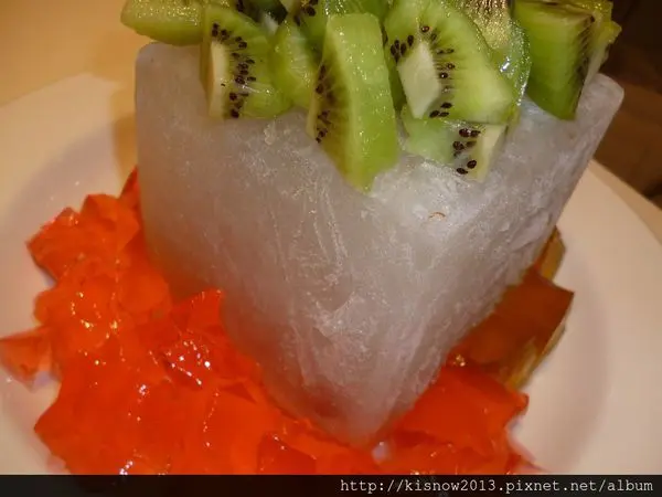 吃完紹興紫米冰淇淋,我對水果冰磚沒有健忘,水果冰磚製作須要花費一點時間,所以必須耐心等待,終於美麗的女主角出現,服務人員把冰晶甜心(荔枝冰磚)端上桌,我真的好興奮,晶瑩剔透的白色冰磚,上面擺放綠色奇異果和覆盆子冰淇淋,下面還有一層寒天凍,它讓我有種冷若冰霜的美麗.