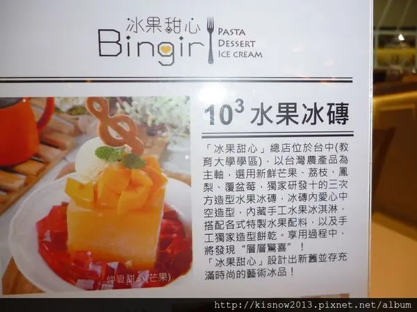 冰果甜心的總店在台中教育大學學區,又是個來自台中發跡的名店,這家店以甜點和輕食為主,店內兩大有名產品,一個是鐵鍋鬆餅,另一個是10的三次方水果冰磚,我這次就是衝著水果冰磚而來,因為它的外型實在太有特色,用水果製作出方型冰磚,冰磚內充滿水果和冰淇淋等配料,整体外型如同冰塊版的蜜糖土司,本來是選擇仲夏甜心(芒果冰磚),後來因為缺貨,而改成冰晶甜心(荔枝冰磚).