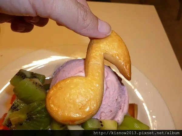 越是冷若冰霜,越是引起我的好奇,越是想把它吃進口裡,先吃最上層的音符餅乾,吃起來的口感紮實,帶著酥香的甜味,再來吃最底層的寒天凍,寒天凍是用綠茶和草莓兩種口味構成的,綠茶口味寒天凍口感微苦清甜,草莓寒天凍則是完全草莓的甜味.