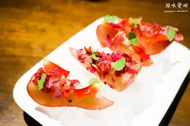 餐前上了好美的玫瑰花瓣點綴的新鮮蓮霧,如同情人節的浪漫,開啟了華麗的序幕。