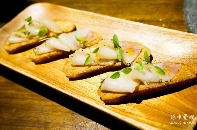 這裡採用義大利帶有點硬度的麵包,搭配旗魚肚做成的醃肉切成火腿肉樣,
